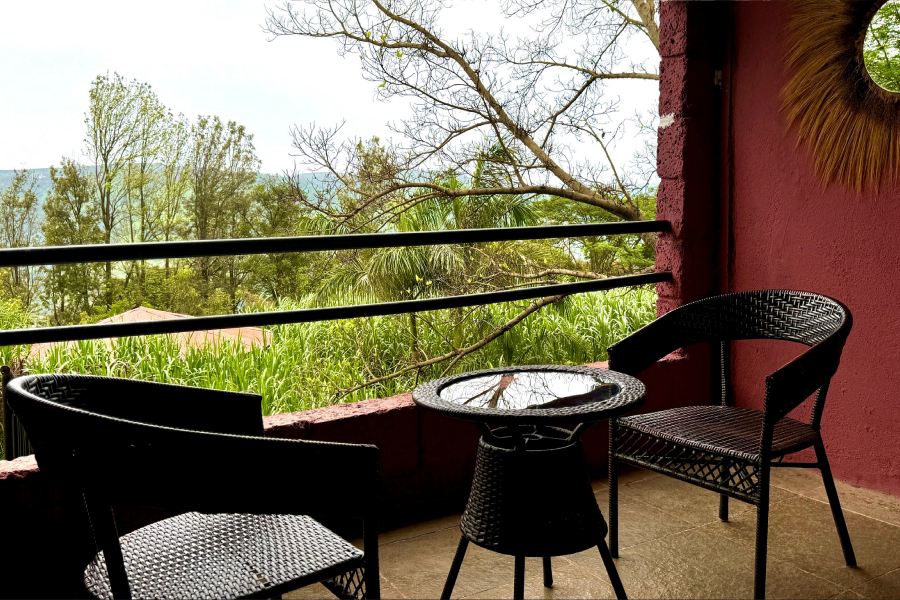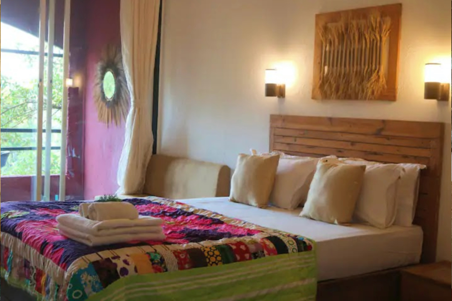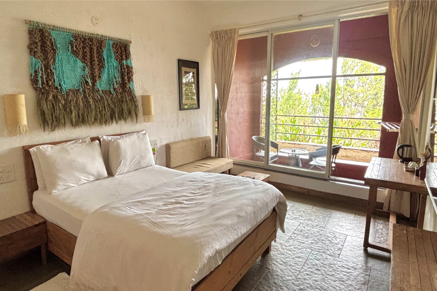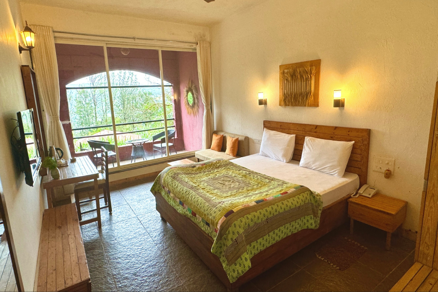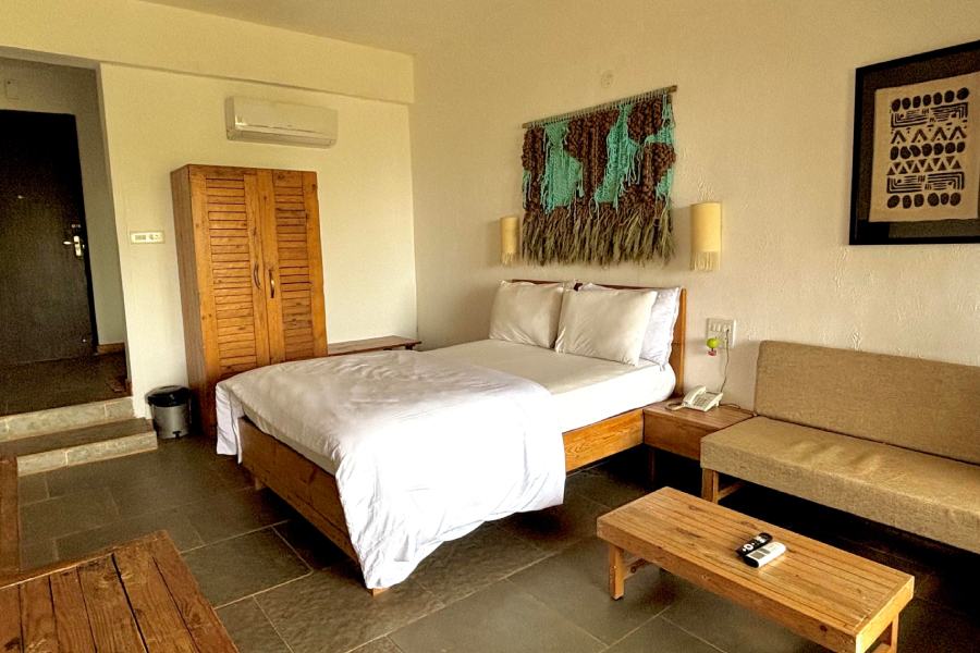 This comfortable and calming room features a cozy queen-size bed, a separate living room with a sofa and table, and a dedicated work desk . The space extends into an open area with access to a private lawn, perfect for relaxing or enjoying fresh air. A cupboard and all essential amenities are provided for a pleasant stay. Soft natural light, peaceful surroundings, and a homely atmosphere make it ideal for couples, solo travelers, or work-from-home guests.