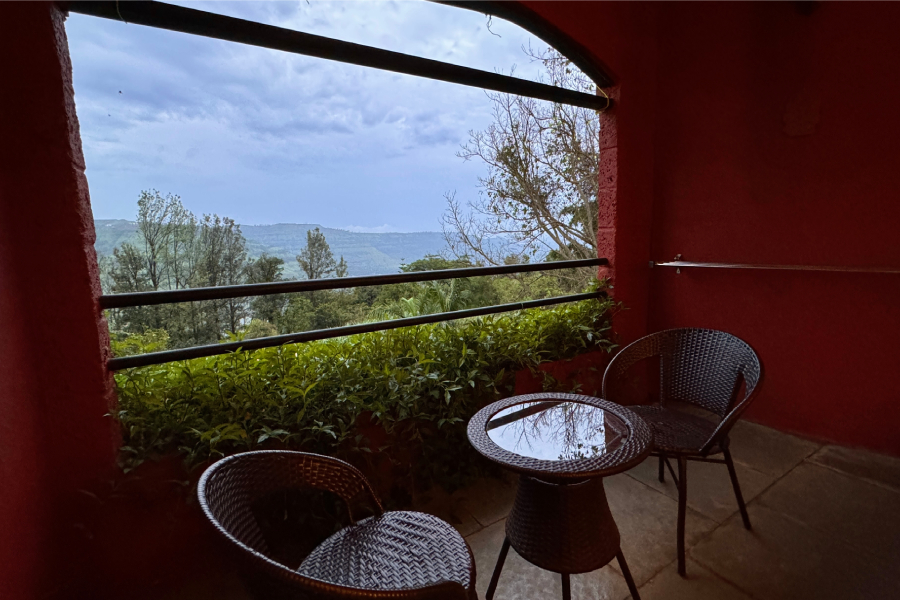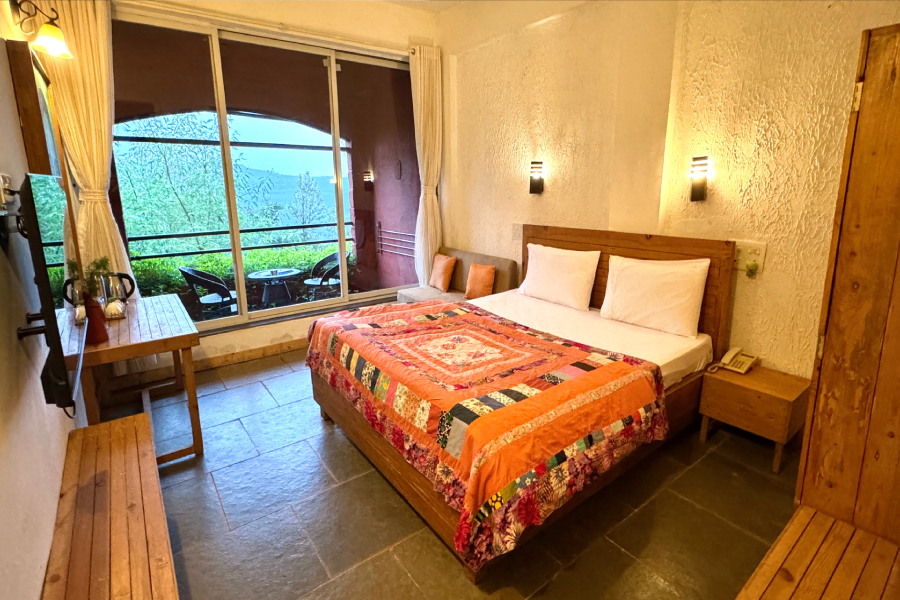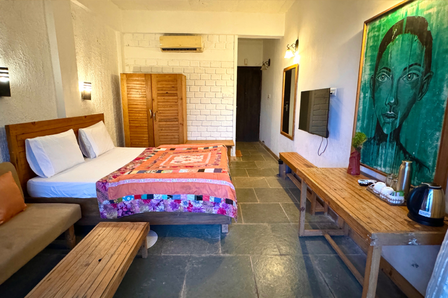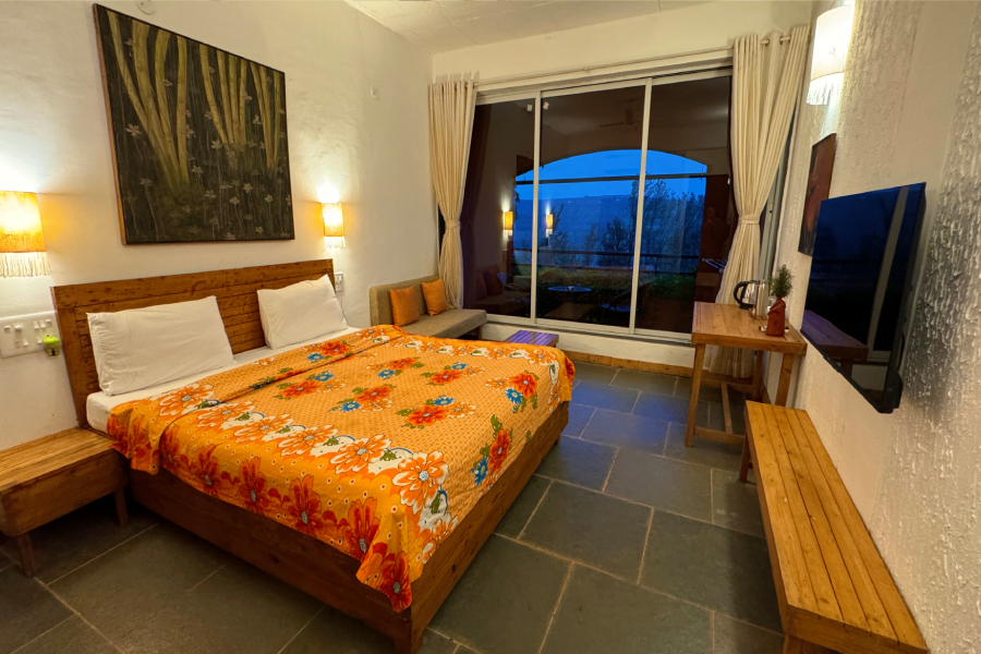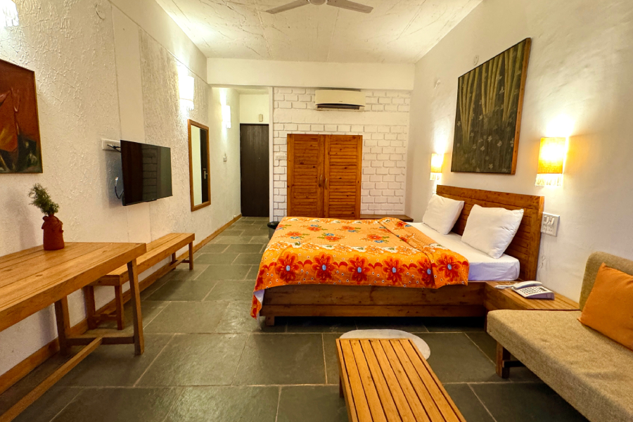This spacious and calming suite is designed for comfort and slow living.Furnished with a cozy bed and a separate seating area, it offers a warm and homely atmosphere. Large windows invite natural light and open views of the surrounding greenery, creating a peaceful feeling throughout the day. Ideal for couples, solo travelers, or long stays, the suite is perfect for relaxing, working quietly, and reconnecting with nature.