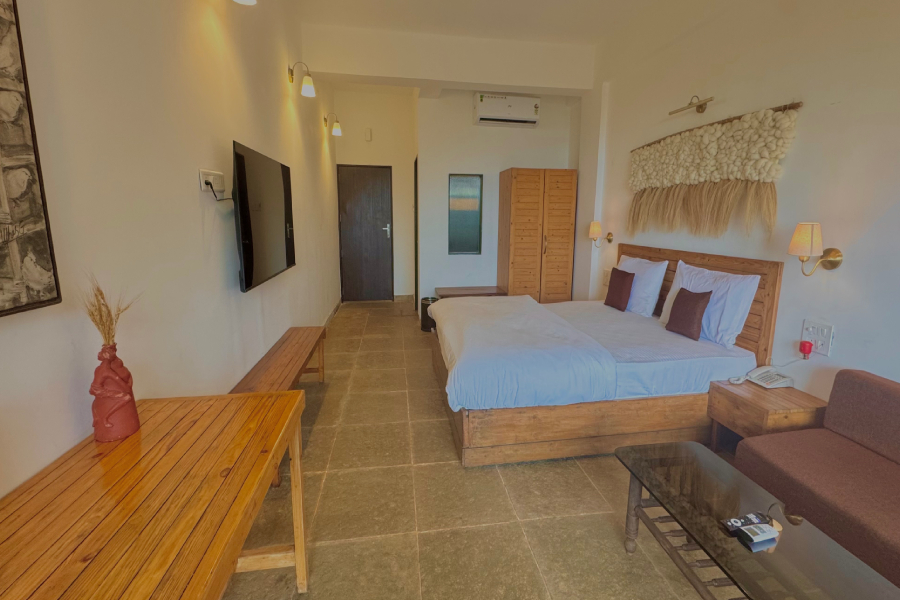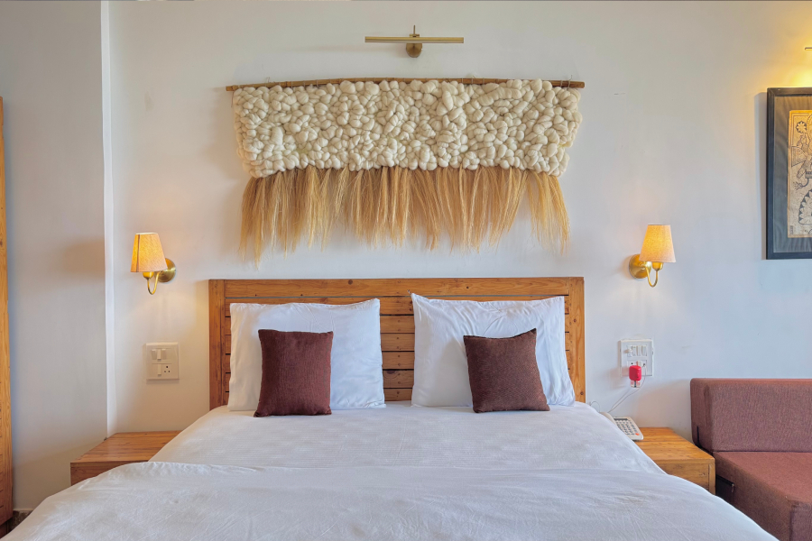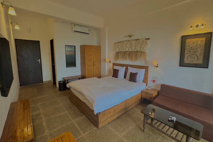 This serene and thoughtfully designed room offers a peaceful escape with beautiful views of the valley and a tranquil pond. Filled with soft natural light, the space feels warm, cozy, and relaxing. It features a comfortable bed, essential amenities, and a calm atmosphere ideal for unwinding. Wake up to birdsong, enjoy fresh air, and soak in nature’s beauty—perfect for couples, solo travelers, or anyone seeking quiet time surrounded by greenery.
